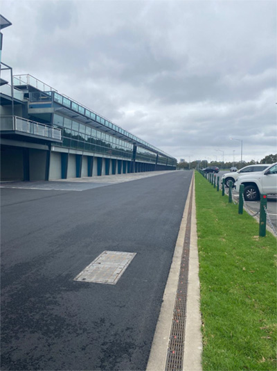 As part of a recent upgrade to the circuit, the pit lane area was extended. To remove rainwater as quickly as possible, designers sloped the pit lane area away from the complex and required linear trench drainage to capture rainfall efficiently. Critical for designers was the safety of drivers. Robust and specialist drainage systems were required to prevent grates from dislodging under speed.