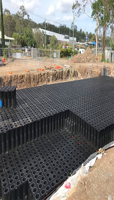Designers were required to incorporate an on-site stormwater detention system to alleviate runoff into the nearby Logan River. The underground tank needed to cater for the storage of both pavement surface water and water from the various roof systems. As well as spread the peak flow of a storm event over a long period, the 550m3 tank needed to be trafficable, durable, easy to install and maintain.