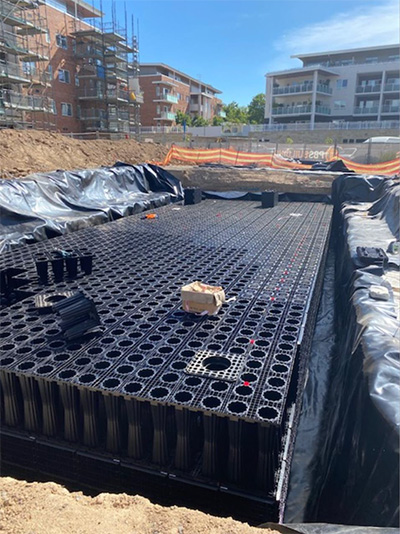 Designers had to incorporate an underground stormwater tank to deal with runoff from the site. Designers needed a detention tank that was quick and simple to assemble and enable easy access for inspection and cleaning.