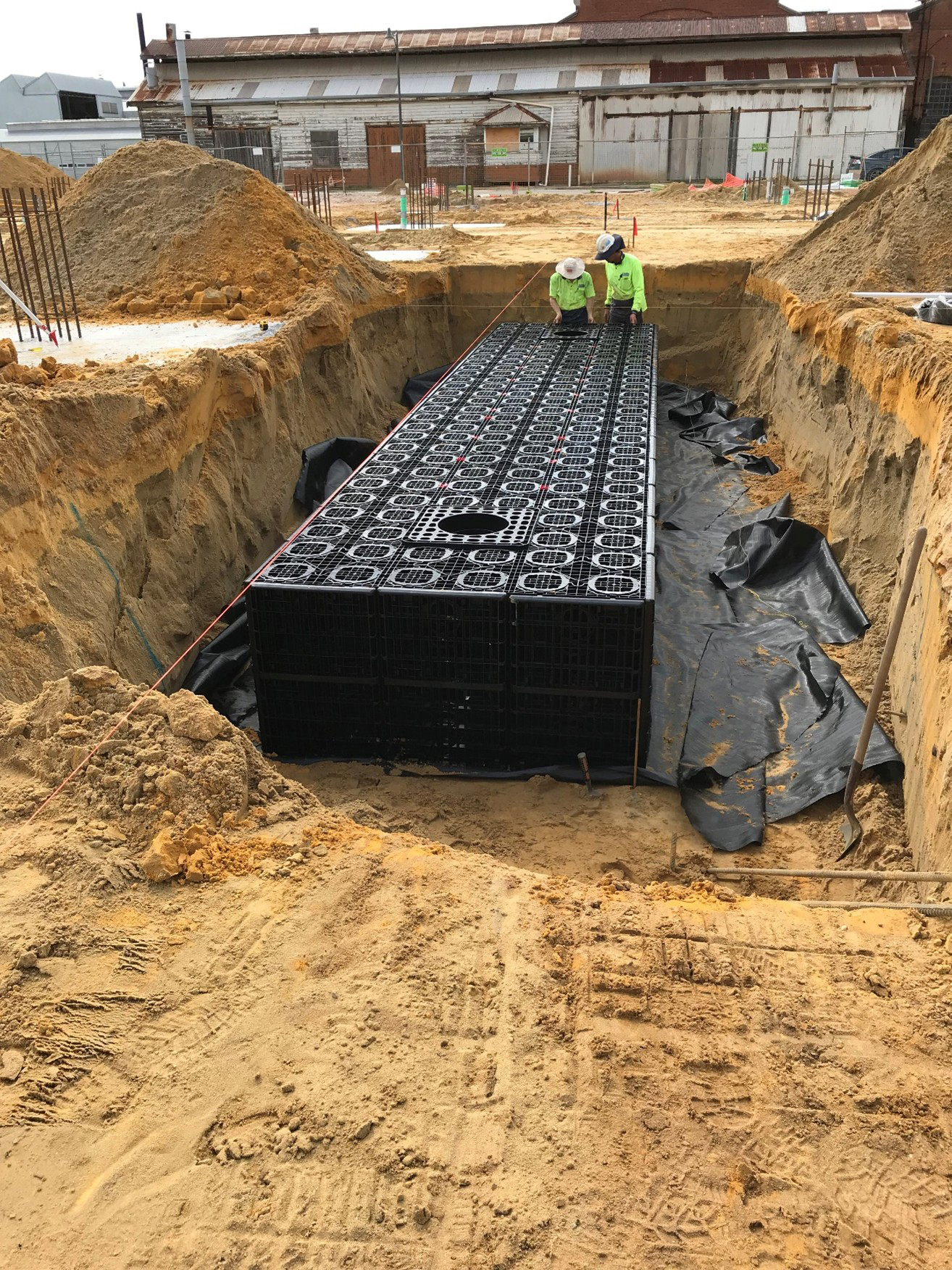 The design intent was to ensure that stormwater captured from the building’s roof could efficiently infiltrate back into the ground. Due to limited available space, designers needed to maximise the storage capacity of the infiltration tank while accommodating the building’s footings and piers.