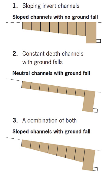 1. For flat pavements, introduce a stepped configuration using neutral channels with varying depths creating a stepped fall configuration or introduce a slope along the base of the trench run using sloped channels with built-in falls to increase the invert depth