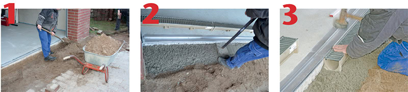 - Position outlet channel or sump unit in the concrete bed and ensure it is level. Connect to the drain or soakaway.