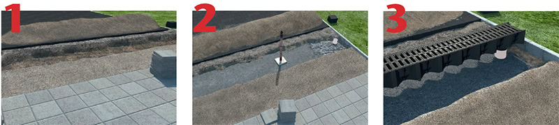 - Ensure the finished paving is 2-3 mm higher than the grates to assist drainage into the channel.