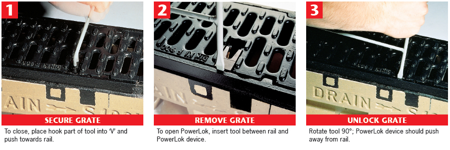 Fast locking device removes the need for bars and bolts and improves the channels hydraulic capacity. The DrainLok mechanism simply clips into the channel edge rail for quick installation.