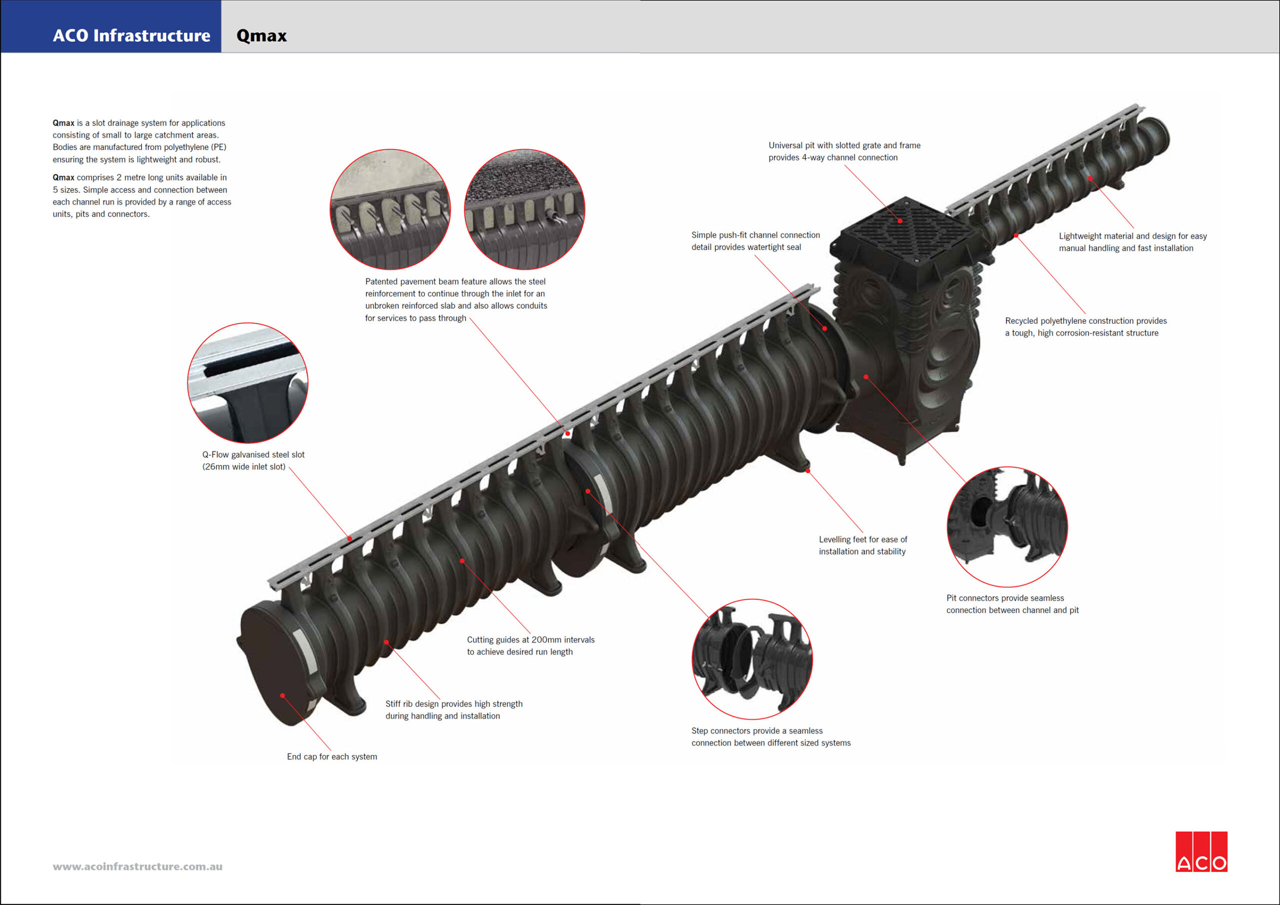 Qmax comprises 2 metre long units available in 6 sizes. Simple access and connection between each channel run is provided by a range of access units, pits and connectors.