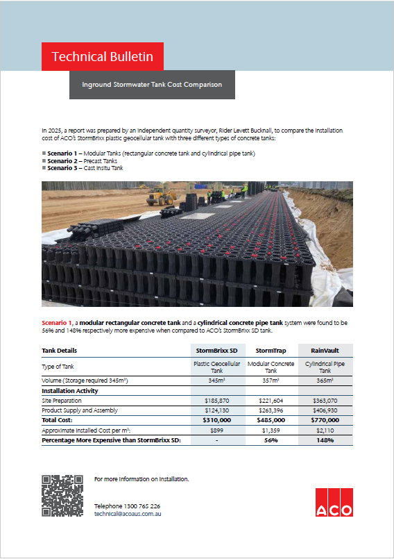 cost of ACO’s StormBrixx plastic geocellular tank with three different types of concrete tanks: